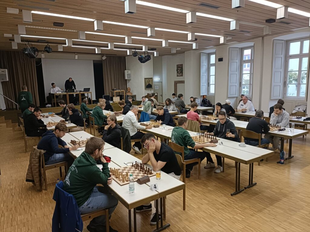 Am Samstagnachmittag gesellen sich mit dem SC Garching und Bavaria Regenburg zwei weitere Teams dazu und nun können die Zuschauer an stolzen 16 Brettern Schach auf Zweitliganiveau beobachten. Unsere Erste spielt gegen den SC Garching und darf zwischendurch auf beide Punkte hoffen. Paul P erringt einen starken Sieg, Thore und Till steuern ein Remis bei. Leider setzt sich am vermeintlich aussichtsreichsten Brett 8 von Alex die Spielidee des Gegners durch, und beim Zwischenstand von 2:4 bleibt nur der Kampf um einen Mannschaftspunkt. Der aber kommt: Paul H bringt uns ran und Andrej holt mit einer absoluten Energieleistung nach 118 Zügen den wichtigen Sieg zum 4:4. Was aber nicht die längste Partie des Tages ist, denn die wird zwischen Regensburg und Viernheim ausgetragen, wo es ebenfalls 4:4 ausgeht.